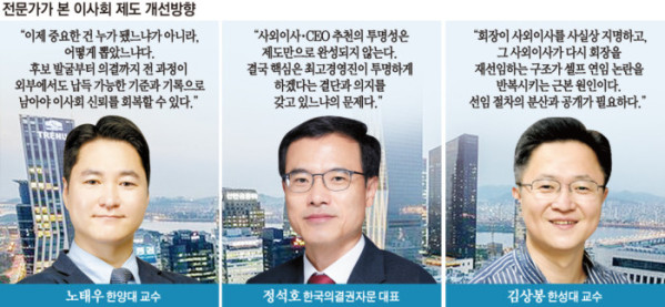 사외이사 선임 구조 자체에 대한 비판도 제기된다. 김상봉 한성대 교수는 “회장이 사외이사를 사실상 지명하는 구조에서는 친분이 있거나 본인을 지지할 인사가 선임되기 쉽다”며 “이들이 다시 회장후보추천위원회를 구성해 현 회장을 재선임하는 관행이 반복돼 왔다”고 지적했다. 그는 “사외이사 후보군을 사전에 공개하고, 이사회나 임원진 등 복수 주체가 참여하는 방식으로 선임 절차를 분산하는 방안도 검토할 필요가 있다”고 말했다.