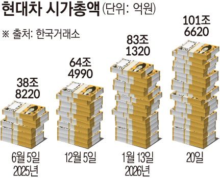대한민국 굴뚝 산업의 상징이었던 현대자동차가 ‘피지컬 인공지능(AI)’ 전략을 앞세워 시가총액 100조 원 시대를 열었다. 정의선 현대차그룹 회장이 5년간 밀어붙여 온 경영 전략과 의사결정에 시장이 처음으로 명확한 평가를 내린 장면으로 읽힌다. 주가에 반영된 것은 자동차 판매 성과가 아니라 ‘정의선 체제’에 대한 신뢰다. 단순한 지표 개선을 넘어 ‘정의선식 리더십’이 증명한 미래 비전이 현대차를 국내 증시의 세 번째 거인으로 우뚝 세웠다.