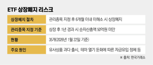 실제로 지난해 상장폐지된 ETF는 50개에 달했다. 같은 기간 신규 상장 ETF는 123개로 상장폐지 수의 두 배를 웃돌았지만, 시장에서는 상품 간 차별성이 크지 않다는 평가도 함께 제기됐다. 인기 테마를 중심으로 유사한 구조의 ETF가 다수 출시된 영향으로 풀이된다.