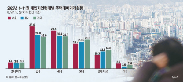 26일 한국부동산원의 ‘매입자 연령대별 주택매매거래현황’을 분석한 결과 지난해 1~11월 서울 주택 시장에서 30대 매입자가 차지하는 비중은 33.6%로 집계됐다. 이는 부동산 불장이었던 2021년(35.8%) 이후 4년 만에 최고치에 근접한 수치다.