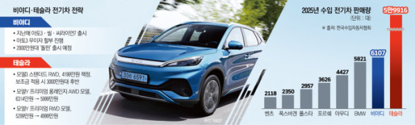중국 비야디(BYD)와 미국 테슬라 등 해외 전기차 신흥 강자들이 국내 시장에서 입지를 빠르게 넓히고 있다. BYD는 이번에 보안 논란을 해소한 데 이어 연초부터 무이자 할부 혜택 등 공격적인 마케팅을 전면에 내세웠다. 2000만 원대 실구매가가 예상되는 신차 출시도 예고하며 보급형 시장 공략에도 나선 상황이다. 테슬라 역시 파격적인 가격 인하 정책을 꺼내 들며 점유율 확대에 속도를 내고 있다.