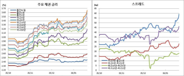 일본 중의원 선거 우려에 일본 금리가 큰 폭으로 오른데다, 오전 중 이재명 대통령의 추가경정예산 발언이 충격을 줬다. 일본 30년물 금리는 25.2bp나 치솟으며 3.8581%를 기록 중이다. 이 대통령은 이날 청와대 국무회의에서 “앞으로 추경 기회가 있을텐데 그때는 문화·예술 분야 예산을 잘 검토해 보라”고 언급했다. 장후반 김용범 정책실장이 이 대통령 추경 발언은 원론적 언급이라며 검토하지 않고 있다고 밝혔지만 이미 엎질러진 물이었다.