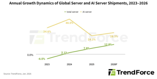 ▲2023~2026년 연간 글로벌 서버 시장과 인공지능(AI) 서버 성장률 (사진-트렌드포스 캡처)