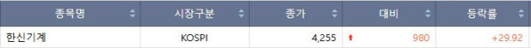 20일 코스피 시장에서 상한가를 기록한 종목은 한신기계다. 전 거래일 대비 29.92% 오른 4255원에 거래를 마쳤다. 시장에서는 신규 원전 논의 재부각이 원전 밸류체인 종목 전반으로 확산하면서 투자심리를 자극한 것으로 보고 있다
