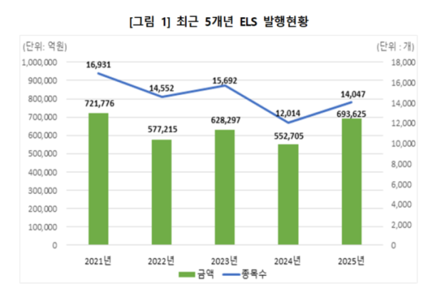 지난해 주가연계증권(ELS·ELB 포함) 발행 규모가 70조 원에 육박하며 전년 대비 큰 폭으로 증가했다. 해외 주요 지수와 국내 주식을 기초자산으로 한 상품 발행이 동시에 늘어난 가운데, 상환 규모는 줄고 미상환 잔액은 다시 증가세로 돌아섰다.