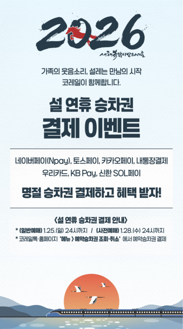 이민성 코레일 고객마케팅단장은 “민족 대명절인 설을 맞아 철도를 이용해주시는 고객님께 감사의 마음을 전하고자 다양한 혜택을 마련했다”며 “가족, 친지와 함께 따뜻하고 즐거운 설 연휴를 보내시길 바란다”고 밝혔다.