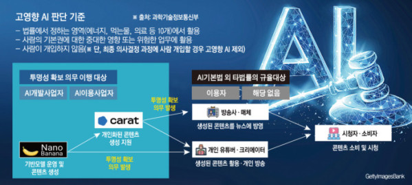 반면 AI툴을 활용해 콘텐츠를 생성하는 개인, 유튜버·크리에이터, 언론매체, 영화제작사, 시청자, 소비자 등은 AI기본법 대상이 아니다. 이들은 AI기본법 외에 정보통신망법 등 다른 법률로 규제한다는 게 과기정통부의 설명이다.