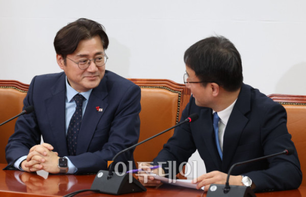 ▲홍익표(왼쪽) 청와대 정무수석이 21일 서울 여의도 국회에서 한병도 더불어민주당 원내대표를 예방하고 있다. 고이란 기자 photoeran@