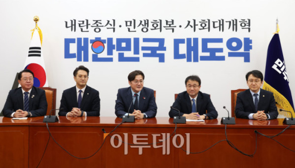 ▲홍익표(가운데) 청와대 정무수석이 21일 서울 여의도 국회에서 한병도(오른쪽 두번째) 더불어민주당 원내대표를 예방하고 있다. 고이란 기자 photoeran@