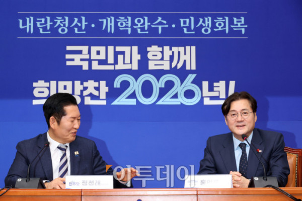 ▲홍익표(오른쪽) 청와대 정무수석이 21일 서울 여의도 국회에서 정청래 더불어민주당 대표를 예방하고 있다. 고이란 기자 photoeran@