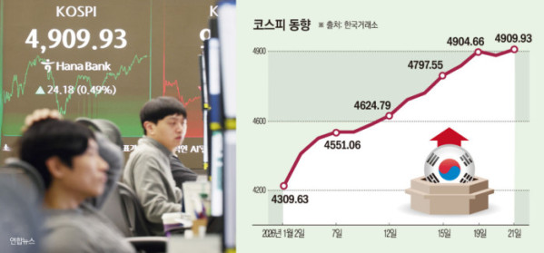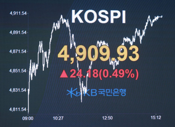 21일 코스피 지수는 전 거래일 대비 24.18포인트(0.49%) 오른 4909.93에 장을 마감했다.