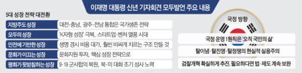 이 대통령은 모두발언에서 △지방 주도 성장 △기회와 과실을 고루 나누는 모두의 성장 △안전에 기반한 지속 가능한 성장 △문화가 이끄는 매력적인 성장 △평화가 뒷받침하는 안정적 성장 등 다섯 가지 대전환과 관련한 구상을 설명했다.