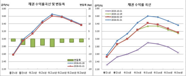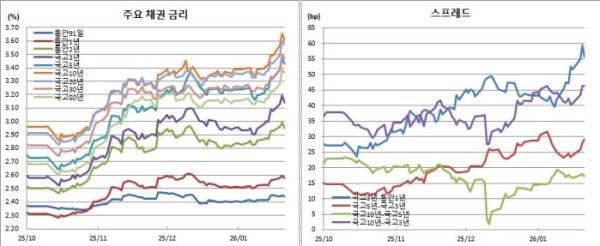 이재명 대통령의 최근 추가경정예산 언급과 관련한 해명성 발언이 우호적으로 작용했다. 이날 이 대통령은 청와대에서 열린 신년 기자회견에서 최근 문화·예술 산업 지원을 위해 추경 편성 가능성을 언급한 데 대한 질문에 “몇십조씩 적자국채를 발행해서 추경하는 건 아니다. 그렇게 하지 않는다”라며 “재원의 여유가 생기고 추경할 기회가 생기면 문화예술 분야에 집중적으로 지원을 늘리겠다는 취지”라고 설명했다. 이같은 언급에 초장기물이 장중 한때 금리 낙폭을 키우기도 했다.