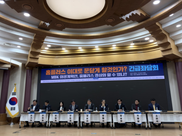 홈플러스가 직원들에게 1월 급여를 지급하지 못하는 초유의 사태가 벌어진 가운데 국회에서 긴급좌담회가 열렸다. 경영진은 긴급 자금 수혈을 호소했지만, 국회와 노조는 대주주인 MBK파트너스의 책임 있는 태도가 우선이라는 입장이다.