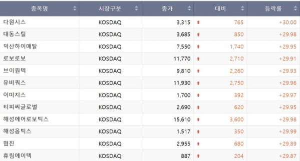 코스닥 시장에서는 다원시스, 대동스틸, 덕산하이메탈, 로보로보, 브이원텍, 유비쿼스, 이미지스, 티피씨글로벌, 해성에어로보틱스, 해성옵틱스, 협진, 휴림에이텍 등이 상한가를 기록했다.