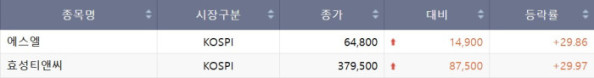 21일 코스피 시장에서 상한가를 기록한 종목은 에스엘, 효성티앤씨다.