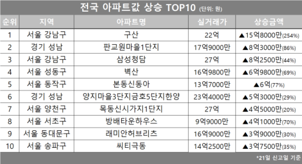 부동산 플랫폼 호갱노노에 따르면 21일 신고 기준 전국 아파트 가운데 실거래가 상승 폭이 가장 컸던 단지는 서울 강남구 ‘구산’으로 나타났다. 이 단지는 22억 원에 거래되며 직전 거래 대비 15억8000만 원(254%) 상승했다.