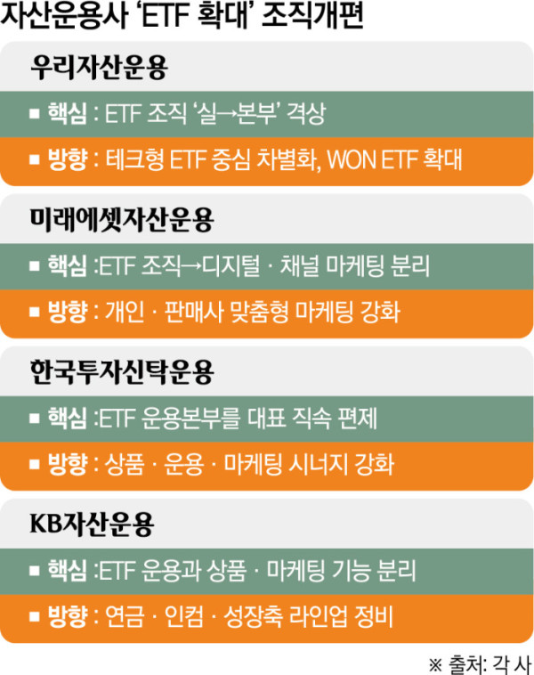 대형 운용사들도 ETF 조직을 세분화하며 기능별 경쟁력을 강화하고 있다. 미래에셋자산운용은 ETF 관련 조직을 디지털 마케팅과 채널 마케팅 부문으로 나눠 개인 투자자와 판매사별 맞춤 영업 전략을 강화하고 있다. 온라인 기반 투자자 유입과 증권사 채널 영업을 동시에 공략하겠다는 구상이다.