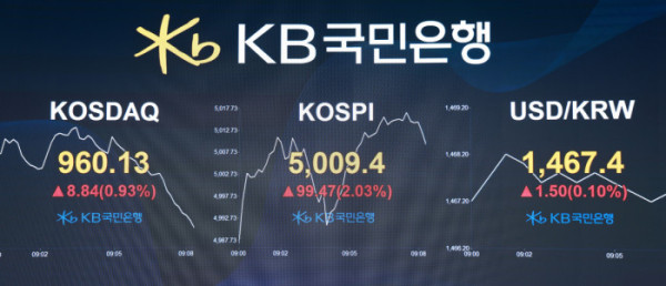 ▲코스피 지수가 5,000선을 기록한 22일, KB국민은행 전광판에 코스닥·코스피 지수와 원/달러 환율 변동이 표시되고 있다.
