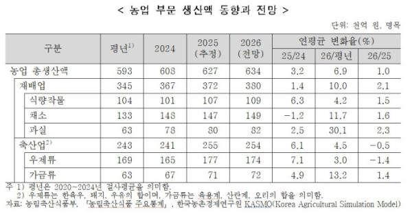 전략작물직불제 확대와 공익직불금 증액 등 정책 효과가 생산과 소득을 떠받치는 핵심 요인으로 제시됐다. 2026년 식량작물 생산액은 10조9000억 원으로 전년 대비 1.5% 증가할 것으로 예상됐다. 채소와 과실 생산액도 각각 1.6%, 2.3% 늘어날 전망이다. 반면 한육우 도축 감소 등의 영향으로 축산업 생산액은 0.5% 감소할 것으로 내다봤다.