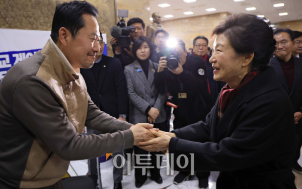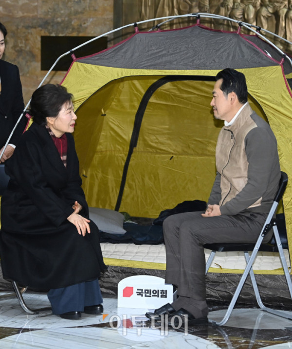 ▲박근혜 전 대통령이 22일 서울 영의도 국회 로텐더홀에서 통일교·공천헌금 '쌍특검' 수용을 요구하며 단식 8일째를 맞은 장동혁 국민의힘 대표 농성장을 방문하고 있다. 고이란 기자 photoeran@