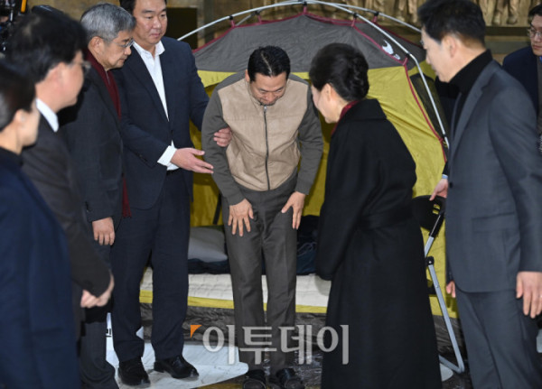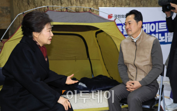 이날 장 대표의 농성장을 찾은 박근혜 전 대통령이 "오늘 이 자리에서 단식을 그만두겠다 이렇게 약속을 해주셨으면 한다"고 말하자 장 대표는 "그렇게 하겠습니다"고 답했다. 고이란 기자 photoeran@