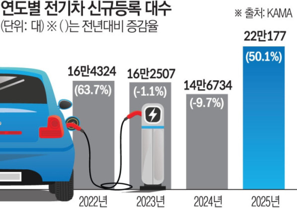 한국자동차모빌리티산업협회(KAMA)에 따르면 지난해 국내 전기차 신규 등록은 전년 대비 50.1% 증가한 22만177대로 2023년(-1.1%), 2024년(-9.7%)의 2년 연속 역성장 흐름을 끊어냈다. 그러나 '가성비'를 앞세운 중국산 전기차가 더욱 빠르게 점유율을 늘려가는 상황이다. 특히 테슬라의 중국 생산물량, BYD 등이 시장에 본격 유입되면서 지난해 중국산 전기차 판매는 전년 대비 112.4% 증가했다.