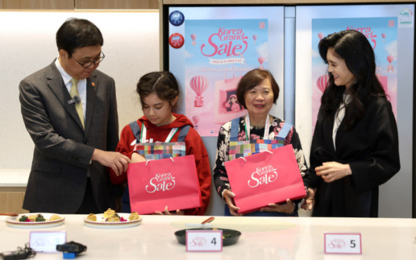 ▲최휘영 문화체육관광부 장관이 22일 서울 영등포구 더현대 서울 문화센터에서 진행되고 있는 코리아그랜드세일의 체험행사 '케이-소스 활용 한식 쿠킹클래스'에 이부진 한국방문의해위원회 위원장과 함께 참여해 외국인 관광객에게 선물을 전달하고 있다. (사진제공=문화체육관광부)
