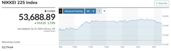 이날 일본 증시는 미국 증시 호재가 전해지며 5거래일 만에 반등했다. 그린란드를 사이에 두고 불거진 미국과 유럽의 갈등이 완화하면서 외국인 유입세가 컸다.