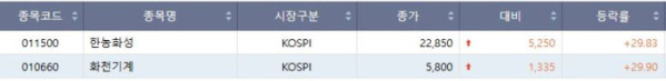 22일 코스피 시장에서 상한가를 기록한 종목은 한농화성, 화천기계다.