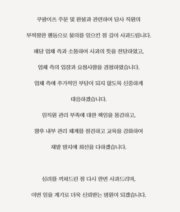 이 내용이 사회관계망서비스(SNS)와 온라인 커뮤니티를 통해 확산되면서 주문 주체로 특정 A 성형외과가 지목되고 별점 테러 등이 이어지자 이에 대표 원장 명의로 홈페이지에 사과문을 게재했다. 22일 A 성형외과 측은 공식 사과문을 통해 “주문 및 환불과 관련해 직원의 부적절한 행동으로 물의를 일으킨 점을 사과드린다”며 “해당 업체와 소통해 사과의 뜻을 전달했고, 내부적으로 직원 관리와 교육을 강화하겠다”고 밝혔다. 또 재발 방지를 위해 내부 관리 체계를 점검하겠다고 덧붙였다.