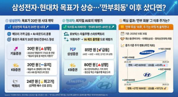 증권가가 삼성전자와 현대차의 목표주가를 잇달아 상향하고 있습니다. 메모리 가격 급등과 인공지능(AI), 피지컬 AI 기대가 맞물리며 두 종목 모두 이미 주가 재평가 국면에 진입했다는 분석인데요.