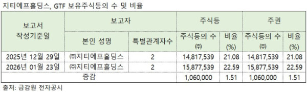 23일 금융감독원 전자공시시스템에 따르면 GTF의 변경 예정 최대주주인 지티에프홀딩스는 GTF주식 106만 주를 장내 매수를 통해 추가로 취득했다. 향후 최대주주 변경이 확정되면 지분은 22.59%로 증가하게 된다.