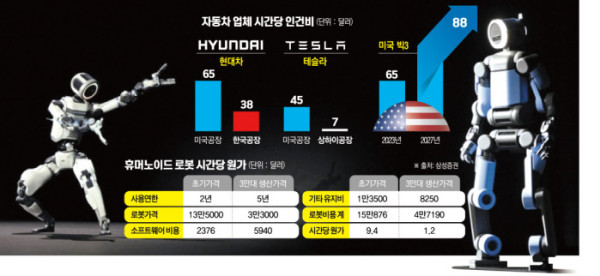 기업 전략 측면에서 로봇은 단순 설비를 넘어 기업 경쟁력으로 직결되고 있다. 증권가에 따르면 미국 제조업 평균 인건비는 연간 7만~8만 달러 수준이다. 반면 휴머노이드 로봇 ‘아틀라스’는 배터리 교환 방식으로 사실상 24시간 가동할 수 있다. 초기에는 시간당 원가가 9.4달러에 달하지만, 생산 대수가 3만 대를 넘으면 1.2달러까지 떨어진다. 이는 중국 제조업 인건비의 약 6분의 1 수준으로 추정된다.