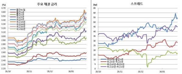 한국은행 기준금리(현 2.50%)와 국고3년물간 금리차는 63.7bp로 확대됐다. 국고채 10년물과 3년물간 장단기금리차는 0.4bp 확대된 45.3bp를 보였다. 21일에는 46.4bp까지 벌어져 지난해 6월5일(47.9bp) 이후 7개월만에 최대치를 경신한 바 있다.