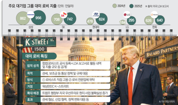 국내 주요 그룹들의 미국 내 로비 활동은 합법적인 정책 소통 수단이다. 정부 차원의 통상 협상이나 그룹 총수들의 현장 경영과는 별개다. 기업들이 물밑에서 펼친 로비 활동은 대관 업무를 넘어 ‘민간 외교’ 역할로까지 확대되고 있다는 평가가 나오는 이유다.