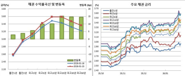 수급적으로도 불안요소가 많다. 중장기물 입찰이 이어지기 때문이다. 재정경제부가 26일 2조5000억원 규모의 국고채 5년물을, 27일 5000억원 규모의 국고채 20년물을 입찰한다. 월말이 다가오면서 단기 자금수요에 따른 채권 매도 가능성도 있다.