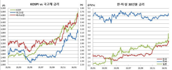 15일 한국은행의 매파적(통화긴축적) 금융통화위원회 이후 휘청였던 채권시장은 일본 금리 폭등과 이재명 대통령의 추가경정예산 발언이라는 원투펀치를 맞고 사실상 혼수상태로 빠져든 모습이다. 올들어 단 하루를 제외하고 역대 최고치를 갈아치우고 있으며 이젠 오천피 안착을 노리는 코스피는 덤이었고, 그린란드를 둘러싼 미국과 유럽간 갈등 와중에 도널드 트럼프 미국 대통령의 유럽 관세 부과 철회(타코·TACO·Trump Always Chickens Out)는 양념이었다.