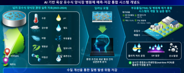 연구팀은 전남과 제주 지역 넙치 양식장에서 2년간 축적한 수온 강수량 풍속 탁도 등 장기 기후·환경 데이터를 활용해 병원체 증식 가능성을 사전에 예측하는 AI 기반 분석 모델을 구축했다. 다변량 회귀와 AI 분석을 결합해 병원체 위험도를 예측하고 양식장이 선제적으로 대응할 수 있도록 한 것이 특징이다.