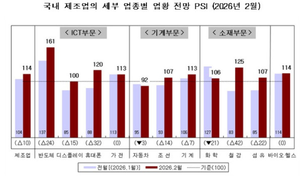 ICT 업황 전망은 128로 전월(107)보다 21p 급등했다. 특히 반도체(161)가 24p 상승하며 압도적인 호황을 예고했고, 휴대폰(120)도 32p 급반등하며 기준치를 크게 웃돌았다. 디스플레이(100)와 가전(113)도 양호한 흐름을 보였다.