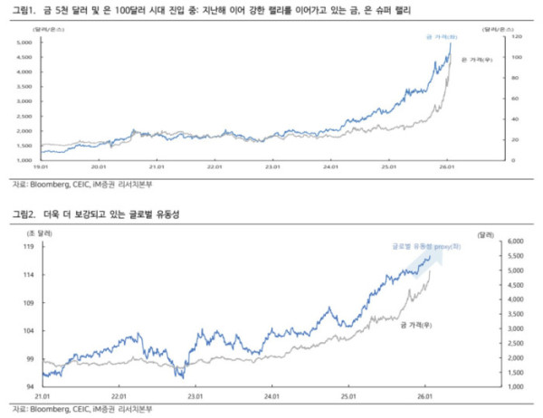 박상현 iM증권 이코노미스트는 이날 보고서를 내고 금 가격 급등의 배경으로 △글로벌 유동성 확대 △지정학 리스크에 따른 안전자산 선호 △헤지(위험회피) 수요 확대를 제시했다. 그는 “팬데믹 이후 전반적으로 유동성 확대 사이클이 이어지는 가운데, 최근에는 그 속도가 빨라지고 유동성이 반복적으로 보강되는 흐름”이라고 말했다.