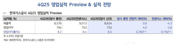 성 연구위원은 한국가스공사의 지난해 4분기 연결 기준 매출이 8조6241억 원, 영업이익이 7316억 원으로 전년 동기 대비 영업이익이 38% 감소할 것으로 전망했다. 이는 1분기부터 4분기까지 이어진 실적 둔화 흐름이 지속되는 것으로, 시장 컨센서스와 대체로 부합하는 수준이라는 평가다.
