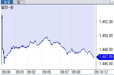 26일 오전 9시10분 현재 서울 외환시장에서 원·달러 환율은 전장대비 18.8원(1.28%) 급락한 1447.0원을 기록 중이다. 이날 1446.1원에 출발한 원·달러는 개장초 1446.0원까지 떨어지기도 했었다. 이는 7일(장중 1445.6원) 이후 최저치다.