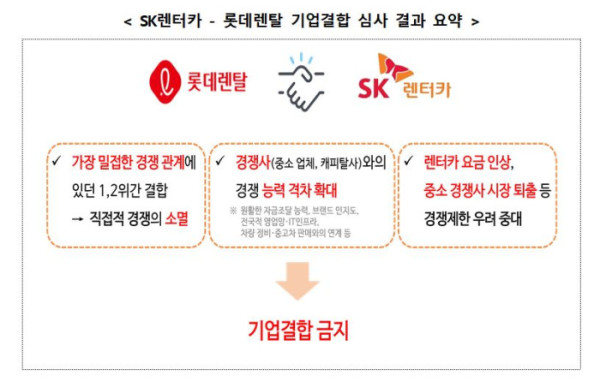 롯데렌탈과 SK렌터카는 원활한 자금조달 능력, 브랜드 인지도, 전국적 영업망・IT 인프라, 차량 정비·중고차 판매와의 연계 등 다양한 측면에서 중소 경쟁사들보다 월등한 경쟁 우위를 점하고 있다. 단기 렌터카 시장에서 롯데렌탈과 SK렌터카는 서로를 제외하면 사실상 유효한 경쟁상대를 찾기 어렵다는 게 공정위 판단이다. 이런 상황에서 두 회사가 결합하면 나머지 사업자들과의 격차를 더욱 크게 벌리며 1위 사업자 지위를 공고히 하게 된다고 공정위는 봤다.