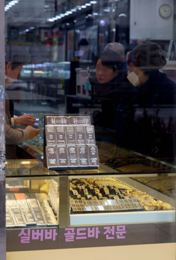 대표적인 안전자산으로 꼽히는 금과 은 가격이 지정학적 긴장과 달러화에 대한 헤지(위험분산) 수요가 증가하면서 사상 최고치 기록을 경신한 가운데 26일 서울 종로구 귀금속상가에 골드바와 실버바가 진열돼 있다. 블룸버그에 따르면 국제 금 현물 가격은 이날(한국 시간) 오전 8시 사상 처음으로 온스당 5000달러를 돌파했다. 은 현물 가격은 앞서 24일 오전 처음으로 온스당 100달러를 넘어섰다.