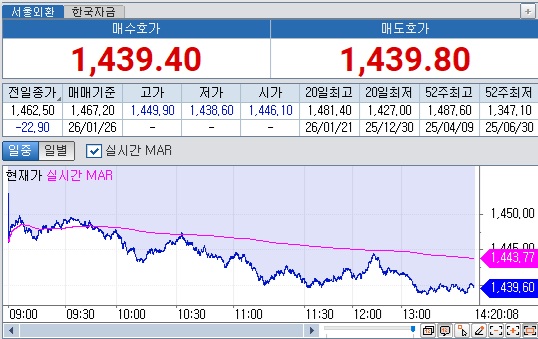 원·달러 환율 26원 넘게 하락하며 1440원 하향, 연중 최저