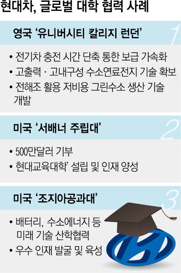 이외에도 2023년 현대차는 조지아공과대학교와 배터리, 수소에너지, 소프트웨어 등 미래 모빌리티 관련 산학 협력을 맺기도 했다. 현대차가 글로벌 유수 대학들과 접점을 넓히는 것은 전동화·수소차 등 가속하는 동시에 글로벌 인재·기술을 선점하려는 장기 전략의 일환이라는 평가다.