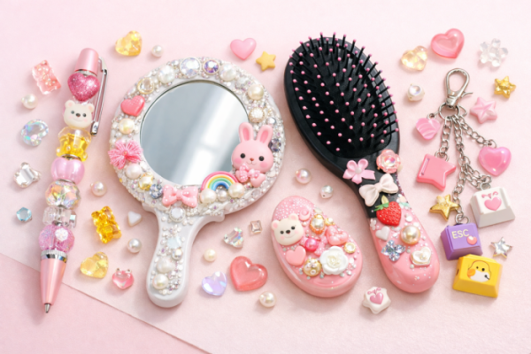 ‘거꾸’와 ‘빗꾸’ 역시 비슷한데요. 거꾸는 손거울이나 휴대용 거울을 꾸미는 방식입니다. 앞서 거울 뒷면이나 테두리를 꾸미는 것을 넘어 볼꾸와 같이 장식이 없는 대에 파츠를 넣어 만들죠. 빗꾸, 빗 꾸미기도 동일합니다. 하트 모양 손거울들은 진주와 큐빅, 리본으로 장식되어 마치 요술봉을 연상시키는데요. 헬로키티와 같은 친숙한 캐릭터와 핑크빛 비즈의 조화는 Y2K 감성을 자극하며 소장 욕구를 불러일으키죠. 모두 사용하는 물건에 개성을 더하는 건데요. 모두 크기가 작고 가볍다는 점, 그리고 꾸민 뒤에도 실사용이 가능하다는 점이 특징입니다.