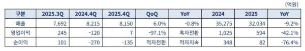 K-IFRS 별도 기준 지난해 4분기에는 매출 8150억 원, 영업이익 7억 원, 순손실 135억 원을 기록했다. 전년 동기 대비 매출은 0.8% 줄었고 영업이익은 흑자 전환했다. 순이익은 적자가 지속됐다.