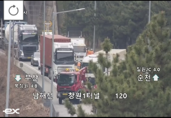 교통 당국에 따르면 이날 오후 1시 51분께 남해선 함안터널 부근(119.5㎞ 지점)에서 1차로 화물차 관련 사고가 발생해 사고 처리 작업이 진행 중이다. 사고 여파로 칠원JC~창원1터널(서측) 구간 평균 속도는 시속 10km까지 떨어진 상태다. 인근 창원1터널·함안터널 일대 전반에 걸쳐 차량 흐름이 크게 지연되고 있다.